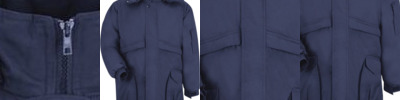 - Zippered pocket on left bicep, pencil pocket underside of storm flap
