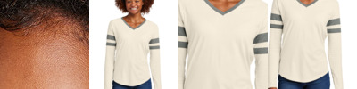 - Colorblock detail at neck and sleeve stripes